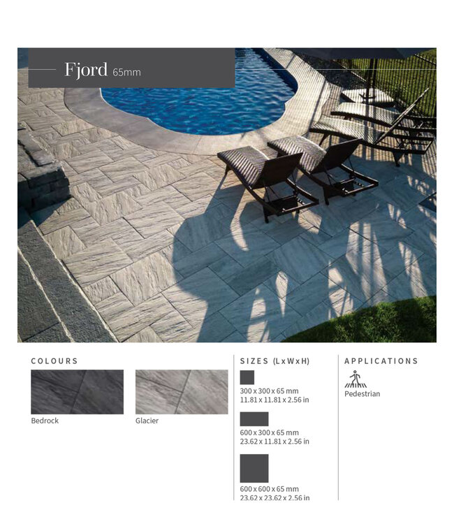 The new Fjord paver has a beautiful slate finish, with subtle color grains and texture. Resulting in a paver that is both modern and natural. Designed for walkways and patios, Fjord is available in three sizes and two colors.