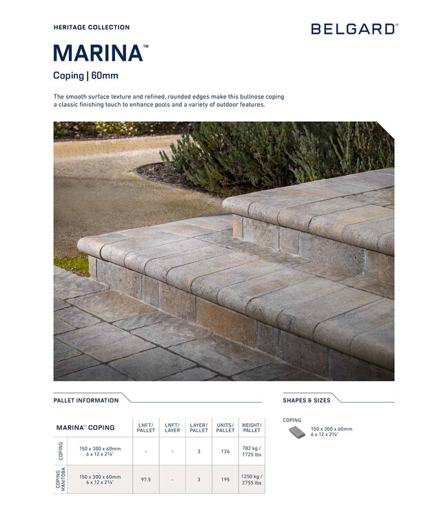 The smooth surface of the Marina Bullnose Coping Unit offers many opportunities that are only limited by your imagination. Whether you are looking for something to surround your pool or searching for a unique step application, the Marina coping will complement many of the pavers and walls within the Belgard collection.