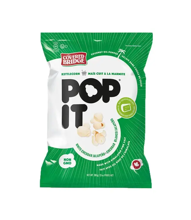 Pop It White Cheddar Jalapeno Kettlecorn is cooked the old fashioned way, just like everything we make at Covered Bridge. Popped in Coconut oil and made with Himalayan Pink Salt our popcorn is sure to be a fan favourite. This popcorn is NON-GMO and Gluten