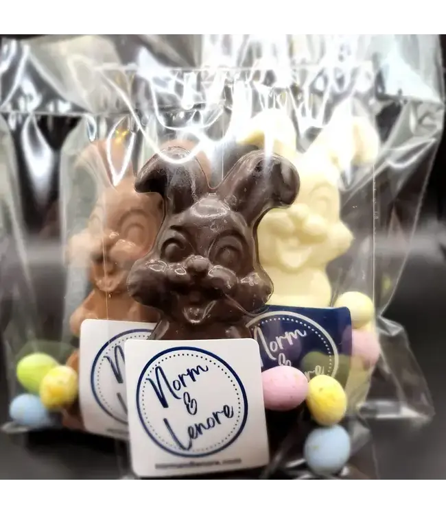 This happy guy is about 5” tall and weighs close to a 1/4 lb. Available in Milk, Dark or White Chocolate.