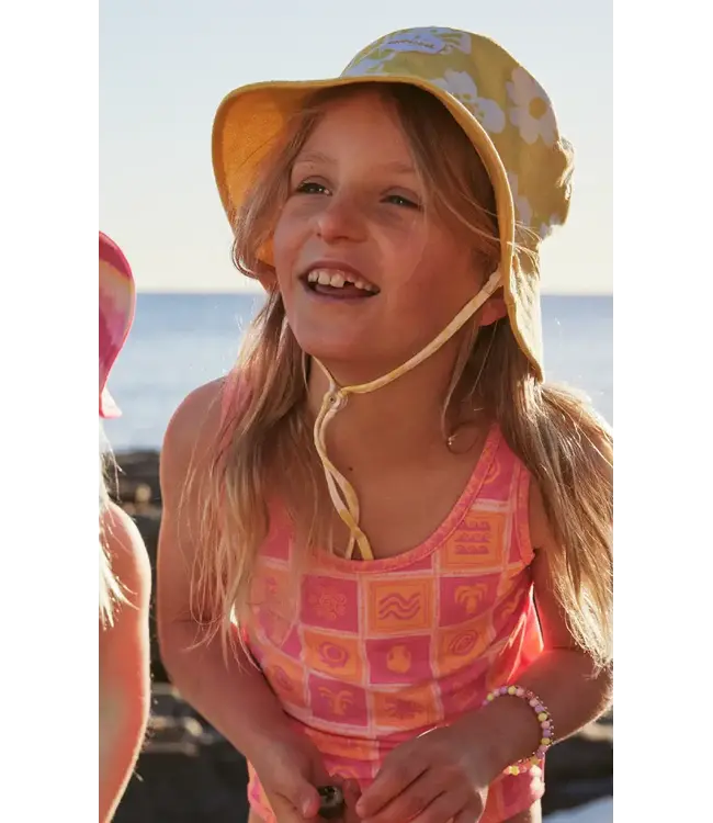 Produced from 100% cotton, it's breathable and keeps the little ones comfortable during the longest days of play. It’s also reversible, flipping to a solid sunny yellow side featuring a bold, embroidered sun detail for a totally different look. With a detachable, adjustable chin strap to keep it secure, it’s a fun, versatile essential for every golden adventure.