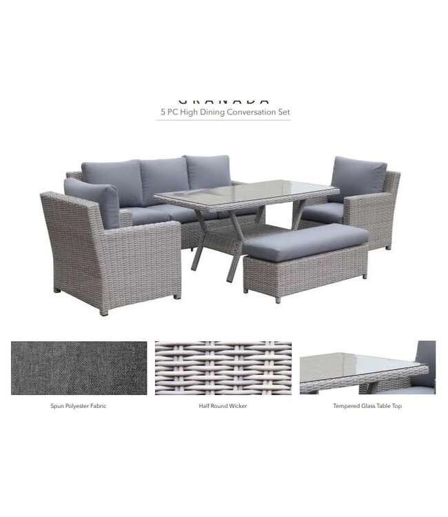 The set features a three-seat sofa, two armchairs, a double ottoman, and a dining height