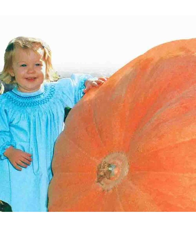 This giant variety can grow to be a monstrous 45-225 kg (100-500 lbs)! Watering frequently and adding fertilizer occasionally may aid its growth. Latin Name: Cucurbita pepo Seed Type: Open Pollinated Online Code: 101566 Product Weight: 3 grams / approximately 8-10 seeds Plant Type: Vegetable Flavor: Earthy with a hint of nutty flavor Days to Harvest: 125 days Days to Seed Germination: 8 to 10 days Seed Planting Depth: 2.5 cm (1") Row Spacing: 1.5-1.8 m (5-6') Plant Spacing: 3 per hill Planting Instructions: Sow a few seeds over a hill 9 to 12 inches tall and 1 foot across. Choose an area with full sun after any chance of frost has passed. Thin to 3 plants per hill when 1 inch tall. When vines are 3 inches high, thin to the strongest plant in each hill. Use a heavy organic mulch to control weeds. After harvest, allow to stand in garden a few days until skin hardens, then store in a cool, dry place. Suggestions: When the fruit sets, prune the fruits until only one or two are left. Preparation Ideas: Best used to make jack o'lanterns.
