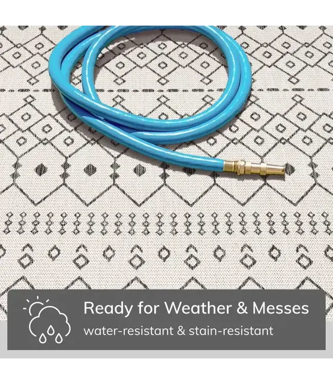 Sweep, vacuum, and rinse the rug with a garden hose, preferably over a rail to help drain away the water, drying thoroughly before replacing. Suitable for any high-traffic room settings including patios, decks, and pools. Synthetic backing is safe for wood floors. A combination of vibrant and lively, neutral and natural colors with contemporary transitional patterns in the Medusa Collection brings the quality and creative flexibility of indoor designs to outdoor spaces. The 100% polypropylene flat-weave pile is UV-protected and mold and mildew resistant. The yarn is stain and fade-resistant and is as easy to clean as hosing it off, making this collection perfect for high-traffic spaces both indoors and out.