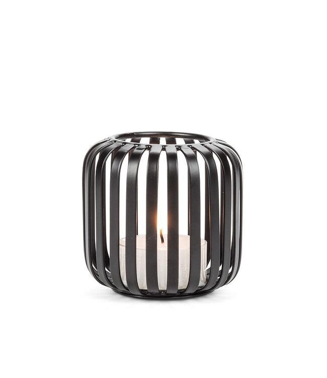 Enhance the warm glow of candlelight with this striking metal Small Ribbed Candleholder. Crafted out of iron with a rich matte black finish, inside and out, this hand-welded and finished Hurricane is sure to add ambience and atmosphere to any setting.