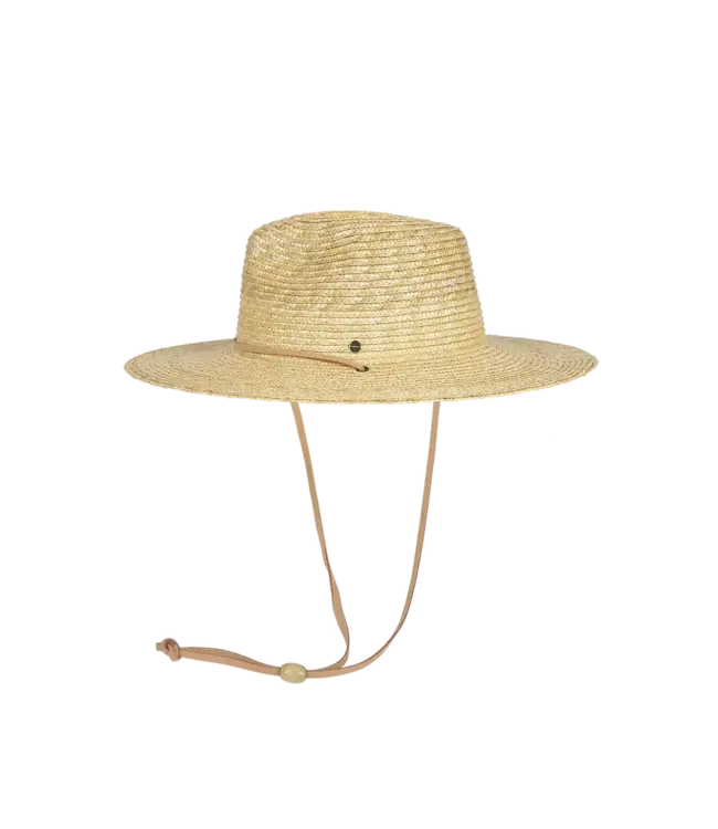 The Georgia is a wide-brim wheat straw hat made for long days under the sun. With a faux leather chin cord, metal logo trim, and elastic sweatband, it’s secure, breathable, and unlined for comfort.